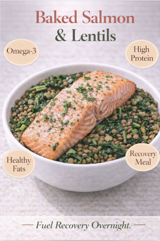 Method: Season and bake salmon at 400°F for 10–12 minutes. Serve over lentil pilaf and greens. Per serving protein: ~34–40 g. Rich in omega-3s for recovery.
