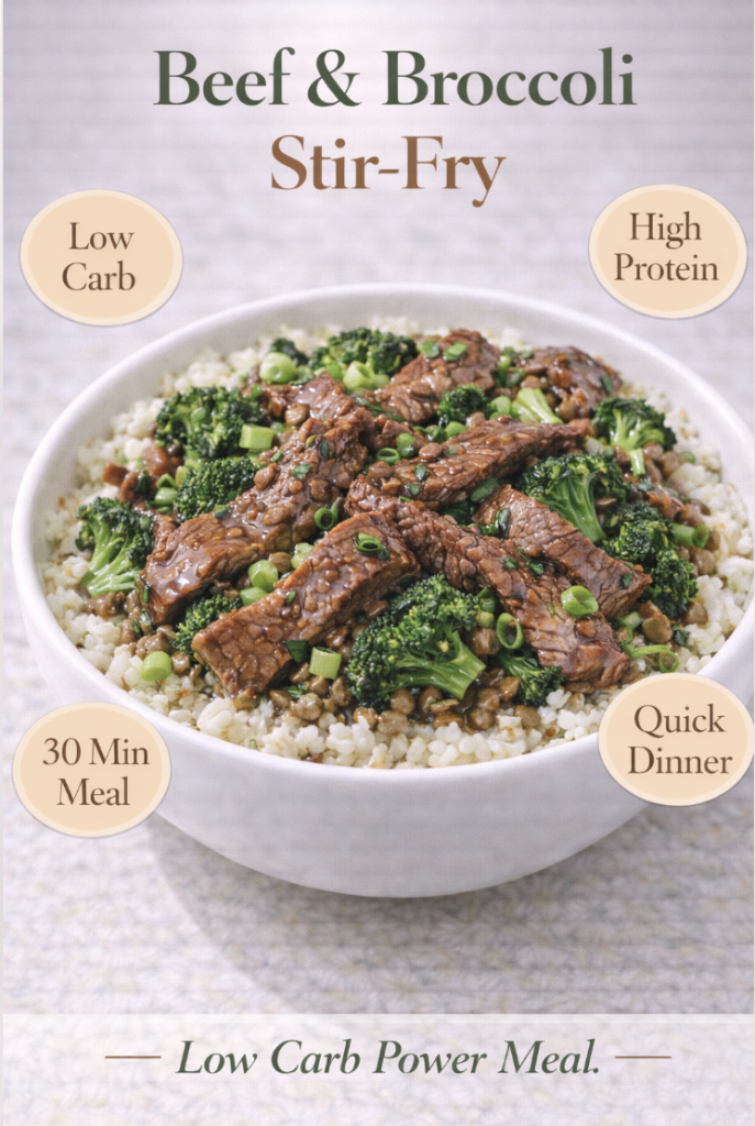 Method: Stir-fry beef, remove, then cook veggies and cauliflower rice: return beef to pan. Per serving protein: ~30–35 g. Swap in more veg to reduce calories.