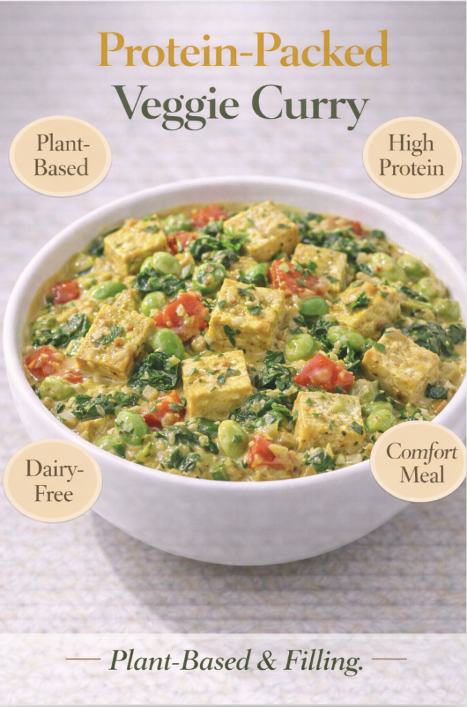 Method: Sear tofu, simmer with curry paste, coconut milk, edamame, and vegetables. Per serving protein: ~15–20 g, boost with extra edamame or a side of quinoa to hit higher targets.