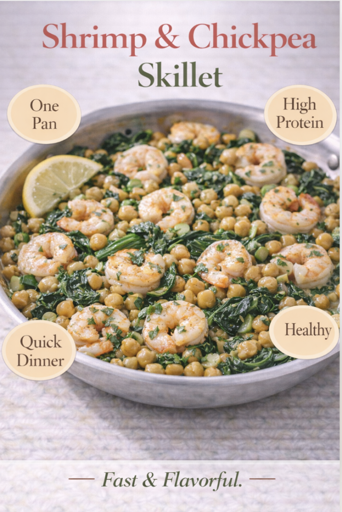 Method: Sauté garlic, add chickpeas and shrimp until cooked, toss in spinach. Per serving protein: ~26–30 g. Fast, flavorful, and nutrient-dense.