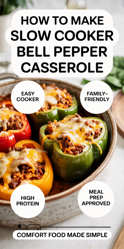 The slow cooker stuffed bell pepper casserole takes everything we love about classic stuffed peppers and simplifies it for day-to-day life. Instead of stuffing hollowed-out peppers, we layer sliced peppers, a well-seasoned meat-and-rice filling, and sauce in the slow cooker. The low, even heat of the crockpot does three important things for us: