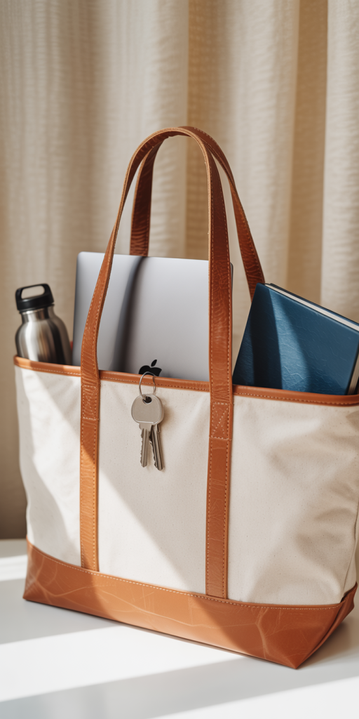 A visual of a large, open-top tote bag, perhaps made of canvas or leather, filled with daily essentials like a laptop, a book, and a water bottle.